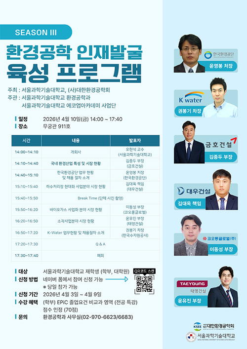 | 제목 | 환경공학 인재발굴 육성 프로그램 ‘SEASON III’ 성황리 개최 | ||||